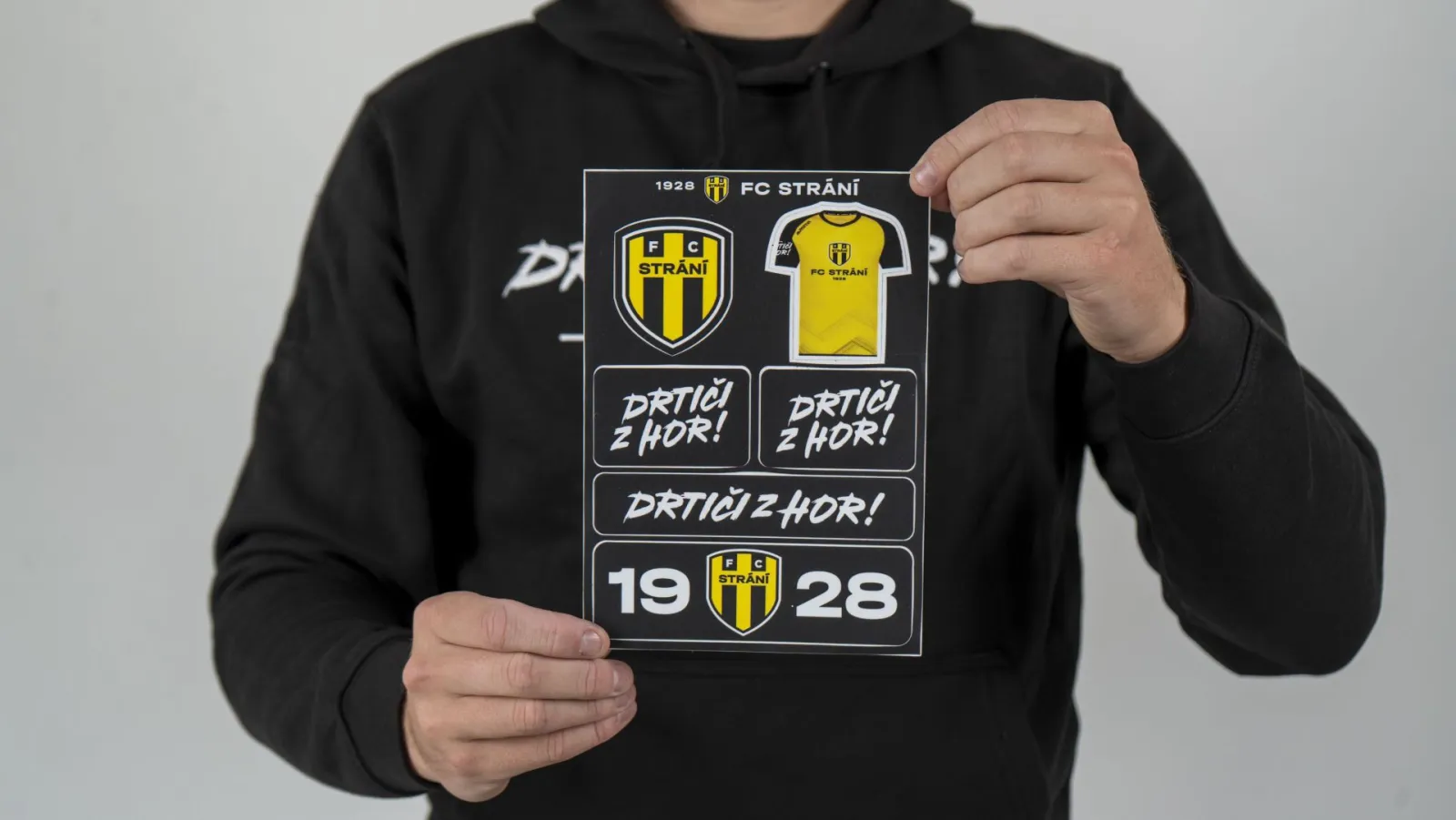 Exkluzivní sada samolepek v elegantní černo-žluté edici, která nesmí chybět žádnému fanouškovi FC Strání.